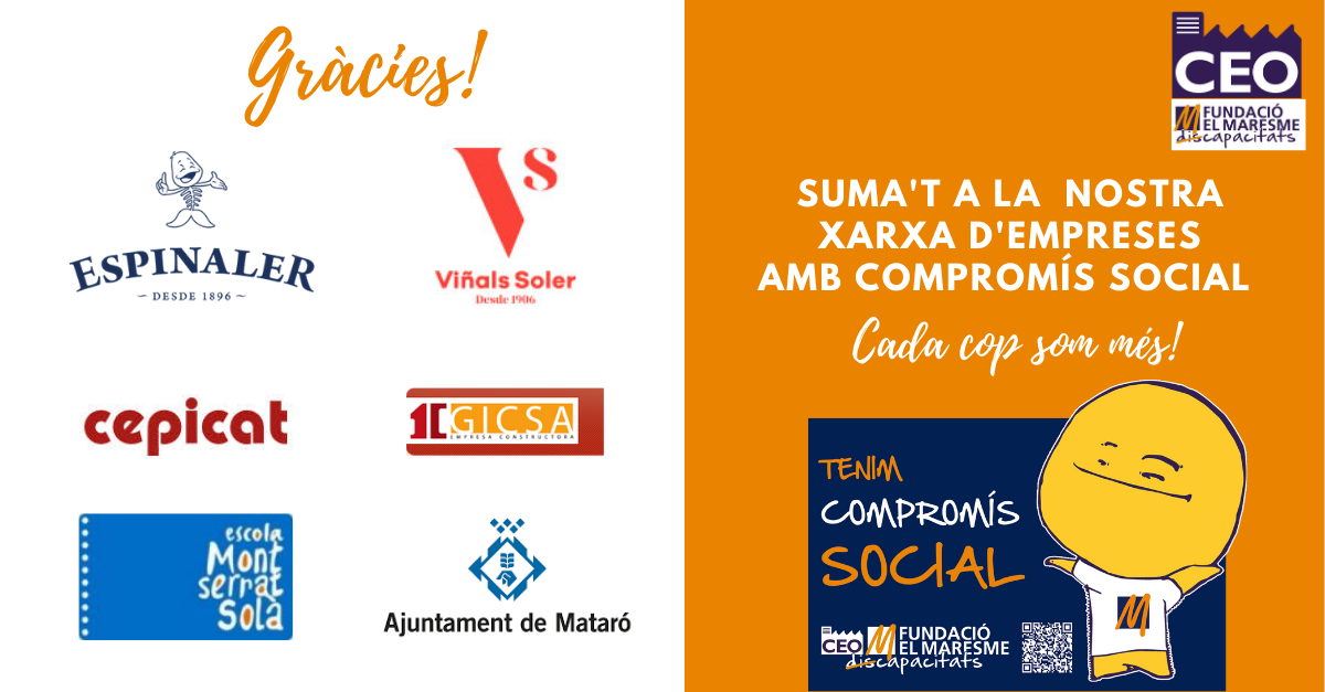 Per aquest motiu, posem de relleu l’aposta per la inserció laboral amb compromís social que demostren Ca l’Espinaler SL, CEPICAT – Cepilleria Catalana SL, Cárnicas Viñals Soler SL, GICSA – Gestió Iniciatives Cabrera SA, així com a l’Ajuntament de Mataró i l’Escola Montserrat Solà de Mataró ja que, gràcies a elles, enguany 5 persones que estaven en actiu al nostre Centre Especial de Treball, el CEO del Maresme, han aconseguit una feina estable a l’empresa ordinària, és a dir, fora de l’àmbit laboral protegit.