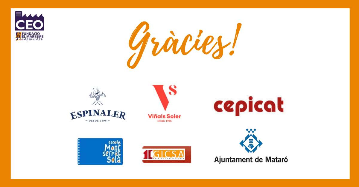 Per aquest motiu, posem de relleu l’aposta per la inserció laboral amb compromís social que demostren Ca l’Espinaler SL, CEPICAT – Cepilleria Catalana SL, Cárnicas Viñals Soler SL, GICSA – Gestió Iniciatives Cabrera SA, així com a l’Ajuntament de Mataró i l’Escola Montserrat Solà de Mataró ja que, gràcies a elles, enguany 5 persones que estaven en actiu al nostre Centre Especial de Treball, el CEO del Maresme, han aconseguit una feina estable a l’empresa ordinària, és a dir, fora de l’àmbit laboral protegit.