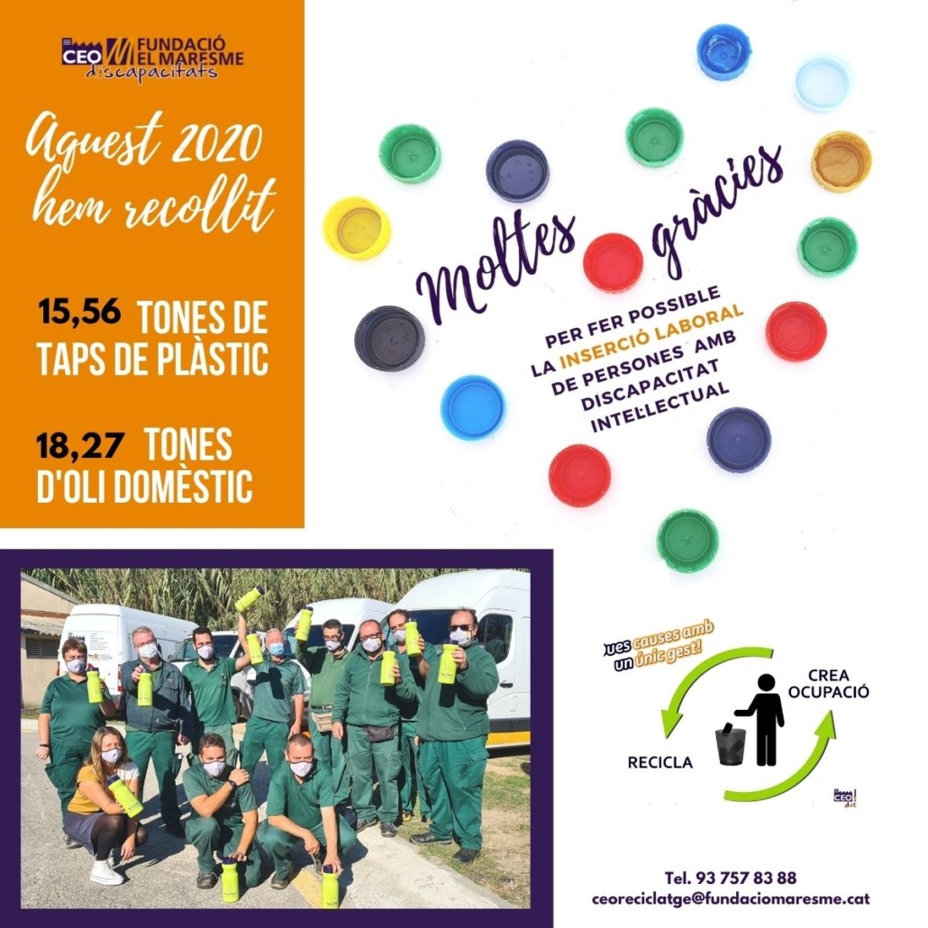 El 2020 ha estat un bon any per al Servei de Recollida Selectiva de Residus del CEO del Maresme, ja que, malgrat la Covid19, el servei ha mantingut el reciclatge d’oli domèstic, 18,27 tones, i de taps de plàstic, 15,56 tones.