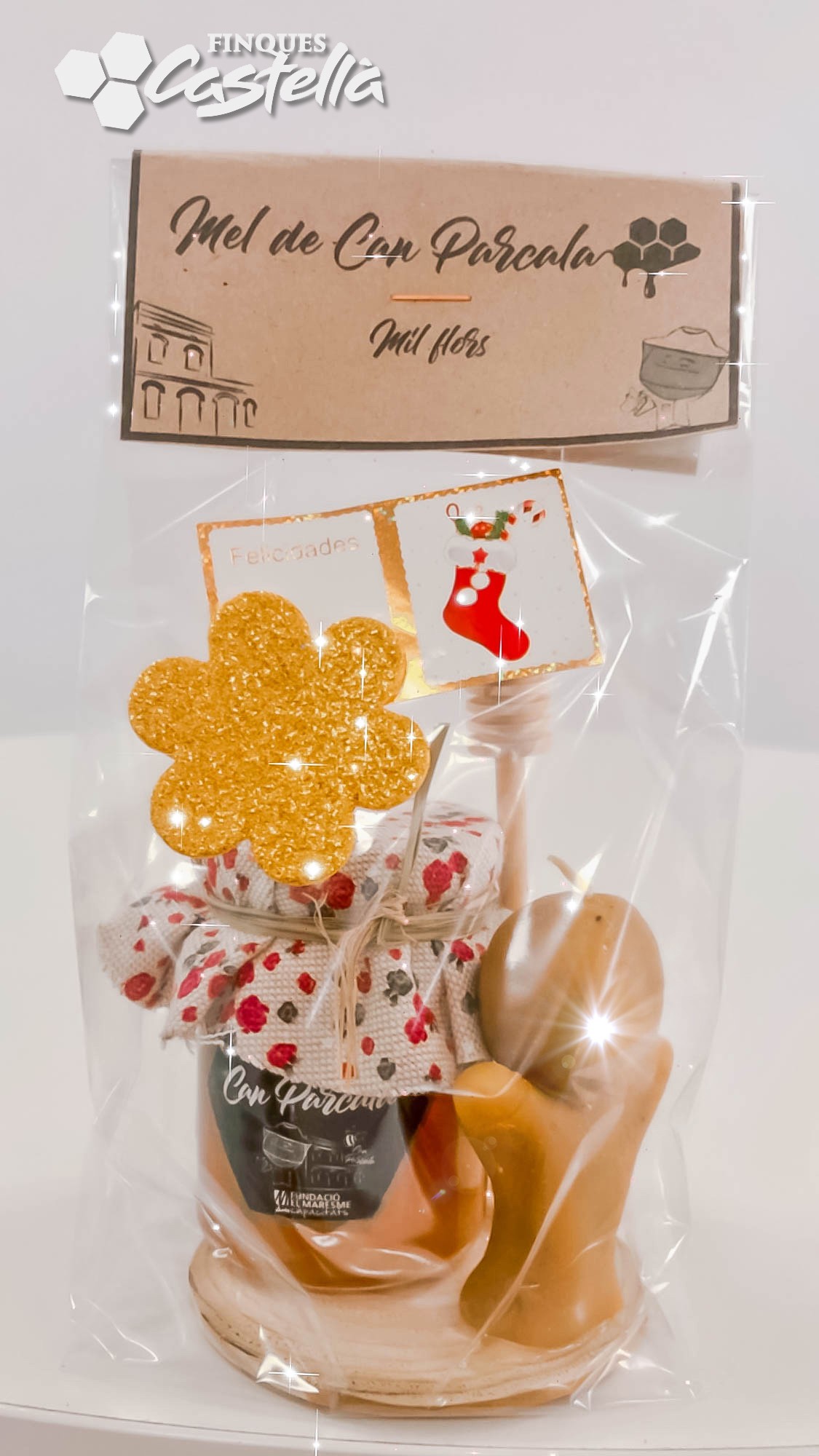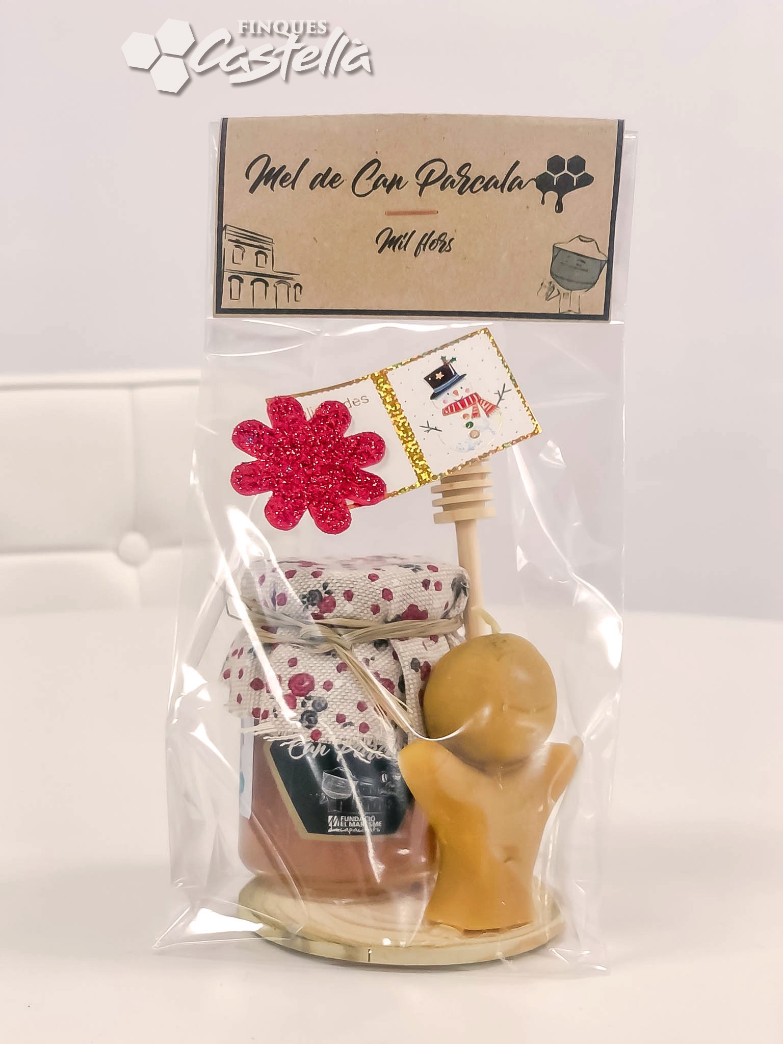 Ens il·lusiona, i molt!, que ens demanin comandes personalitzades com les de Finques Castellà: 250 lots de Mel de Can Parcala amb compromís social preparats a mida, amb targetó, cullera de fusta i espelma d’en Santi per endolcir el Nadal amb salut, proximitat i solidaritat.
