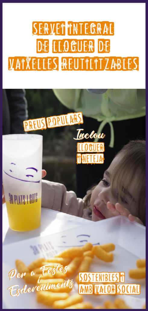 A través de 3R Plats i Gots, el centre especial de treball de la Fundació el Maresme posem a disposició d’administracions públiques, entitats, empreses, associacions i particulars de Mataró i del Maresme un nou servei de préstec de vaixelles i coberts reutilitzables per a tota mena de celebracions: festes majors, esdeveniments especials, aniversaris, actes al carrer, etc. L’objectiu és evitar l’ús de plats, gots i coberts de plàstic i d’un sol ús.